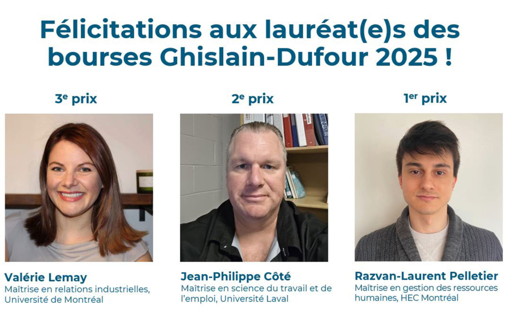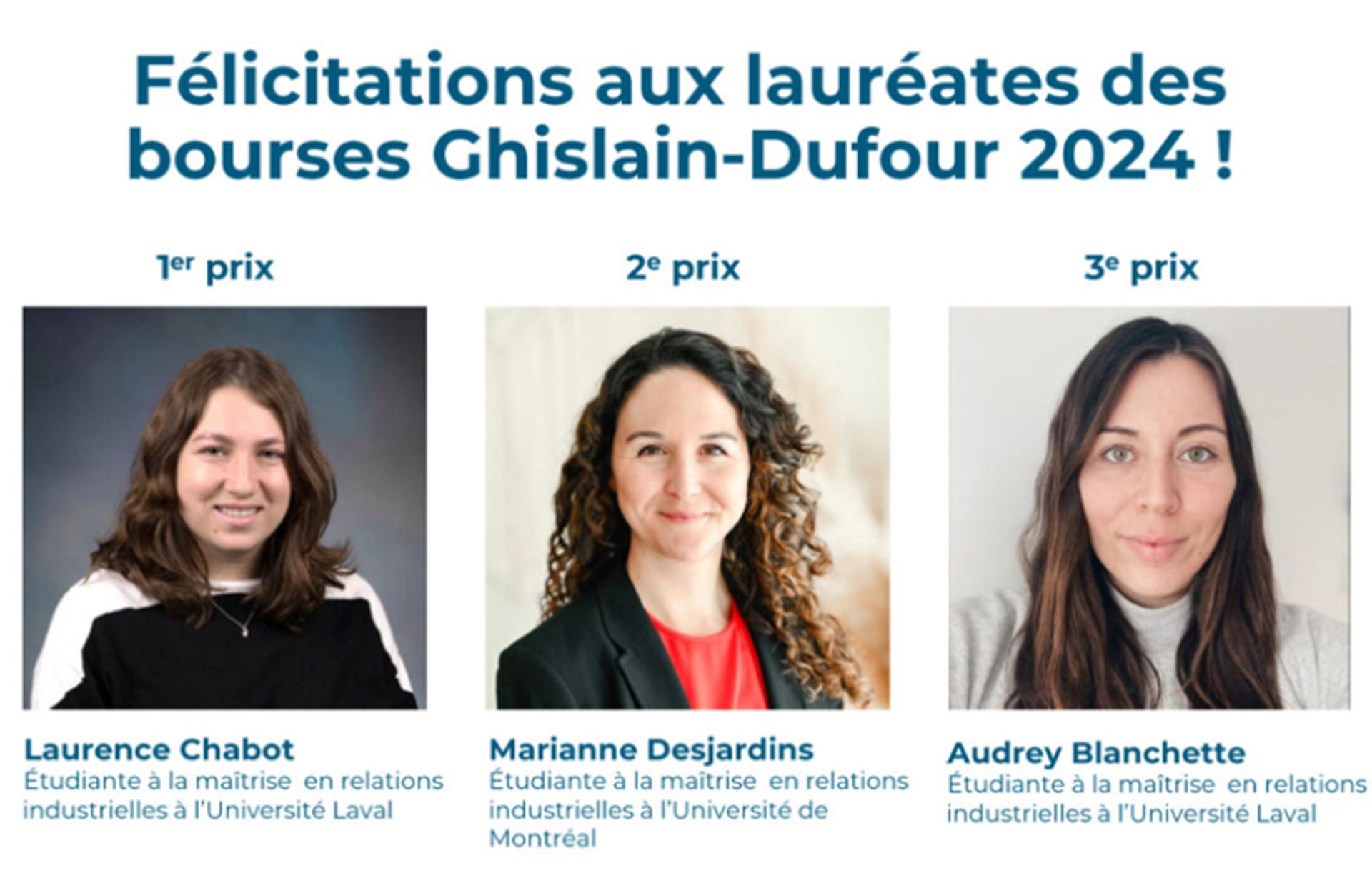 Les Bourses Ghislain-Dufour, du nom de celui qui a été le principal artisan d’une structure patronale unifiée au Québec et qui est associé au CPQ (Conseil du patronat du Québec) depuis sa fondation en 1969, ont été créées afin de souligner l’excellence d’étudiantes et d’étudiants à la maîtrise en relations industrielles.